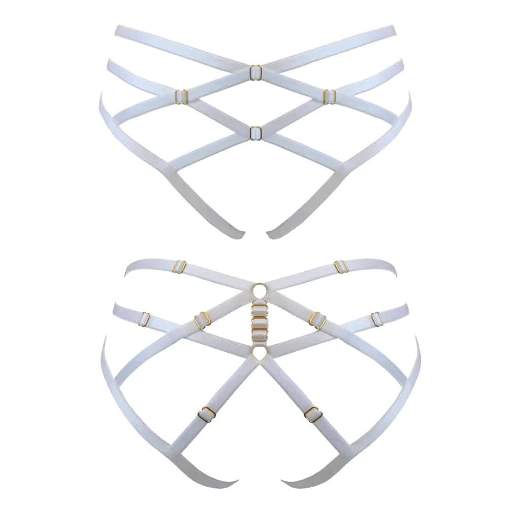 Un harnais totalement ouvert à porter seul ou par dessus une culotte ou un string,