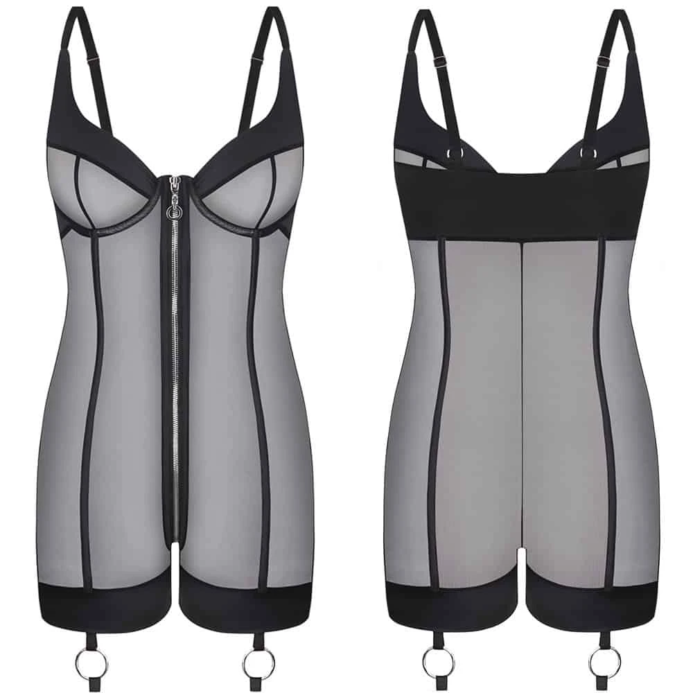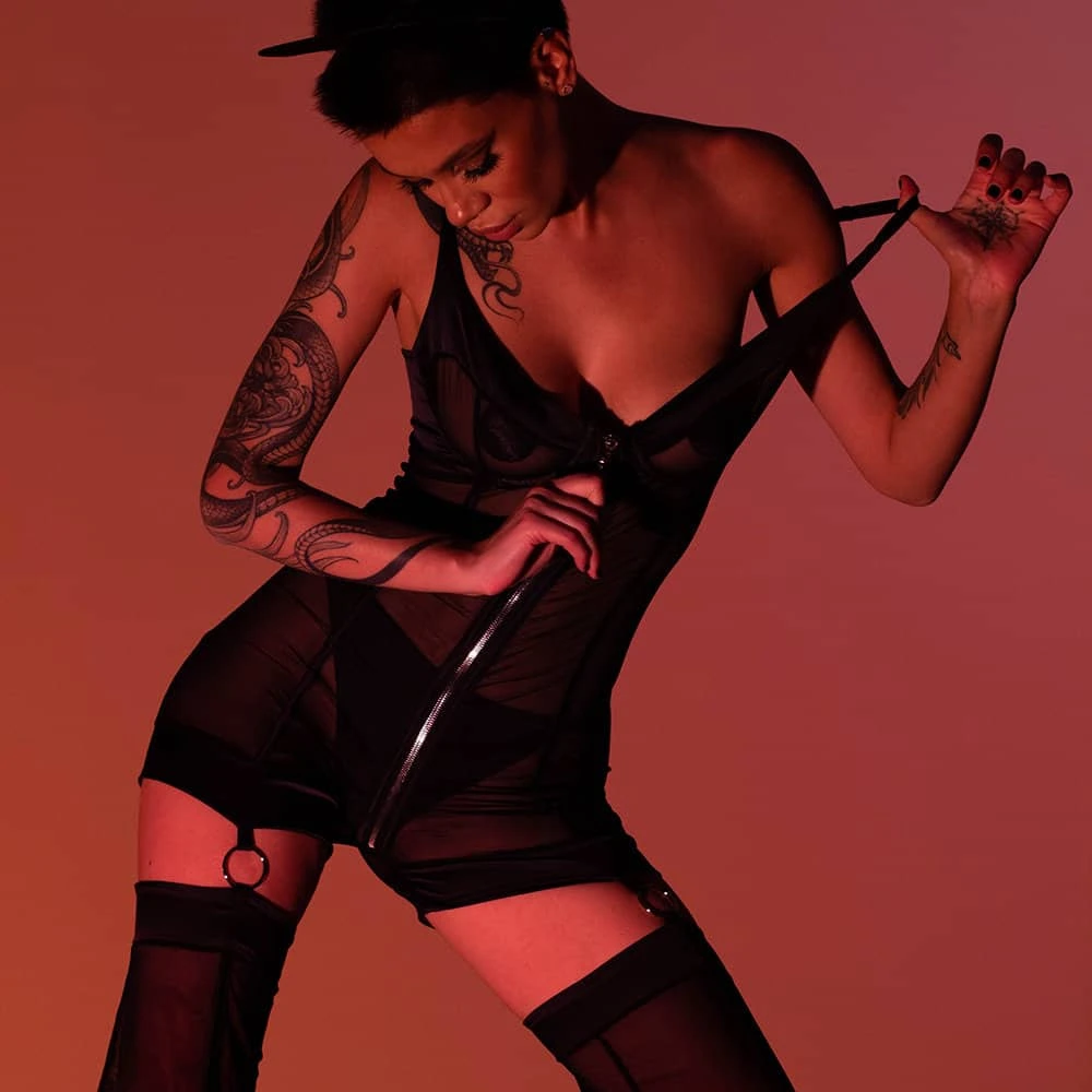 L’ensemble Kitty Pop Catsuit est certainement le plus audacieux des set de cette collection lingerie, en terme de design. Lingerie ou prêt à porter, ce catsuit peut se porter court ou long selon vos envies du moment. L’ensemble est fait de soie extensible et de maille résille fine, avec un buste à armature zippée. Les créations Bæd Stories sont livrées en pochette cadeau.