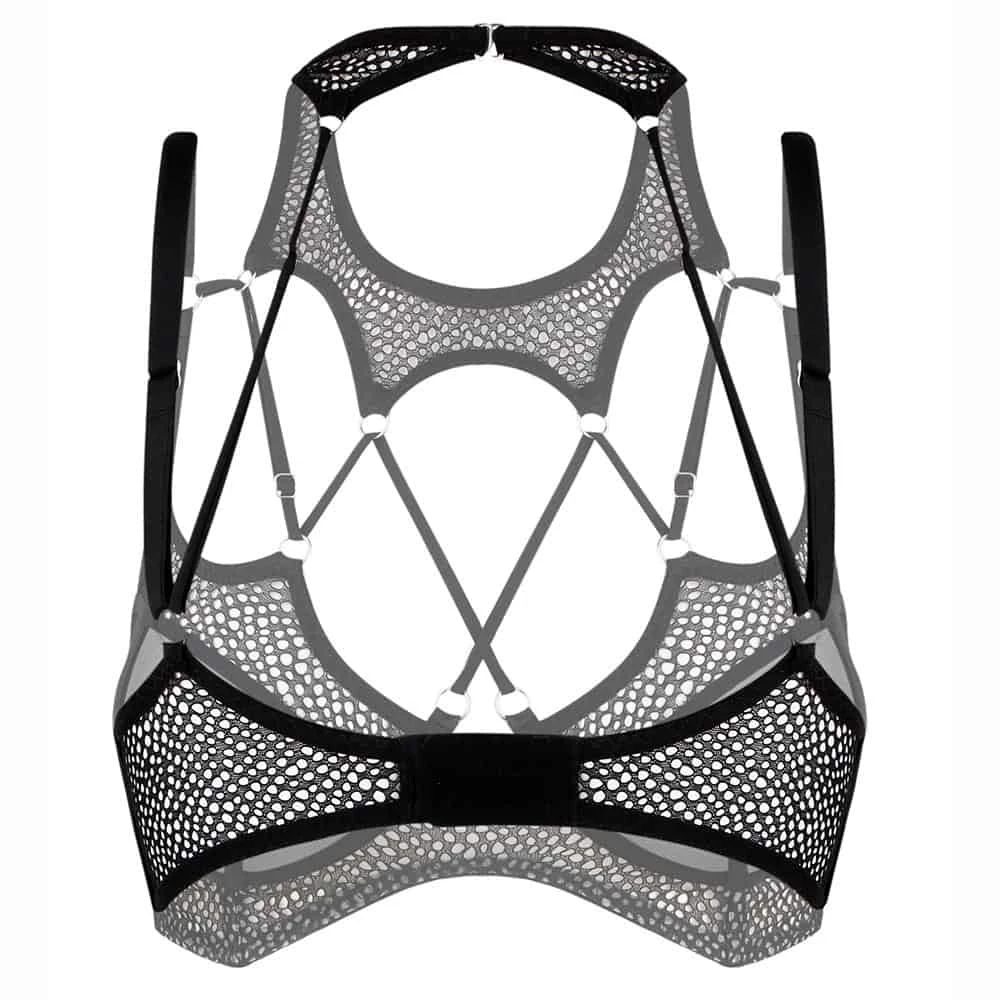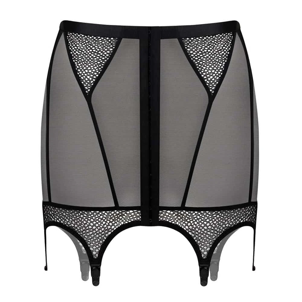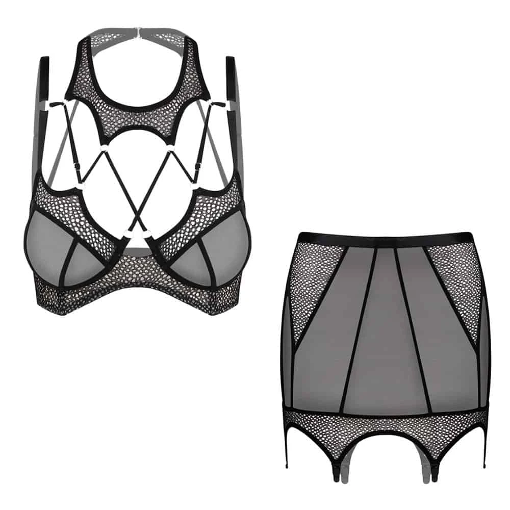 Le soutien-gorge à armature est surmonté d’un collier qui rappelle la toile d’araignée. Fermeture par crochets au dos. La résille fine et semi transparente suggère l’essentiel. Vous pouvez aussi porter ce soutien-gorge avec des nippies. La jupe porte-jarretelles de style gaine moulera votre fessier grâce à sa matière stretch et ses crochets de fermeture à l’arrière. 4 jaretelles pour fixer vos bas cubain ! Le masque de style bandeau compète la tenue et sa dose de mystère.