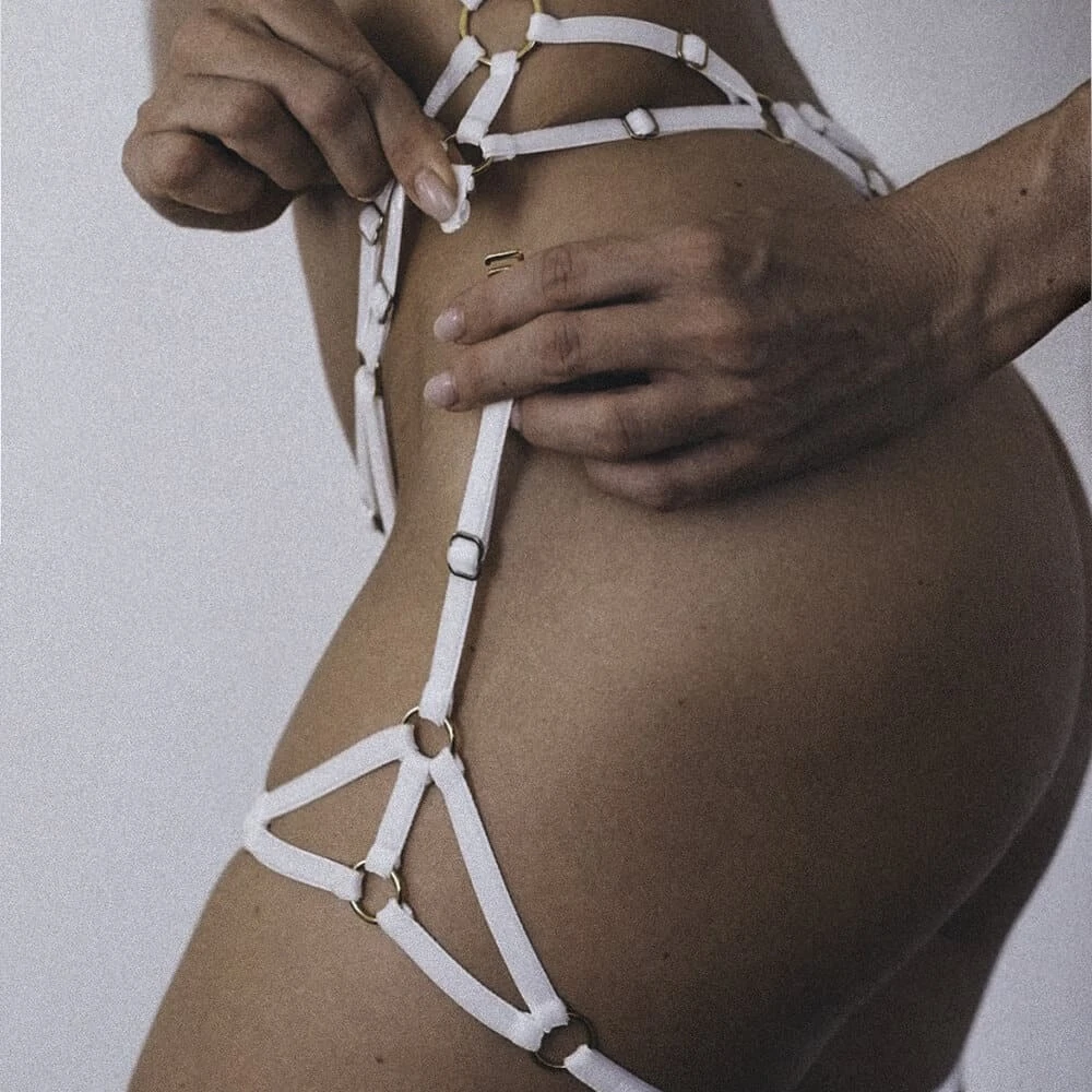 Des playsuits et harnais ouverts inspirés du bondage, plus sexy les uns que les autres, fabriqués à partir d’élastique velours et ajustables à chaque morphologie grâce à un système ingénieux de glissières en plaqué or. Jouez avec les curseur pour un ajustement parfait ! Créations polyvalentes et originales, les harnais Couture de Nuit peuvent être portés seuls pour une soirée très érotique, comme accessoires pour pimenter votre lingerie habituelle, ou encore comme pièces mode et fashion combinées à votre tenue.