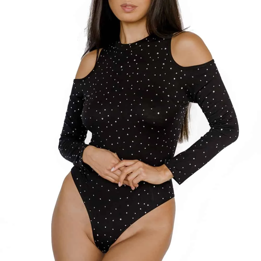 Le body Berta en velours stretch est recouvert de cristaux Swarovski irisés. Cette pièce est un vrai bijoux. Découpes ovales sur les épaules.