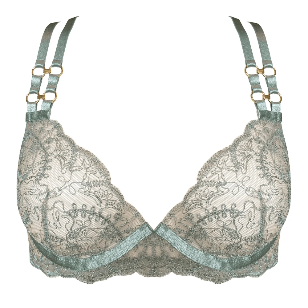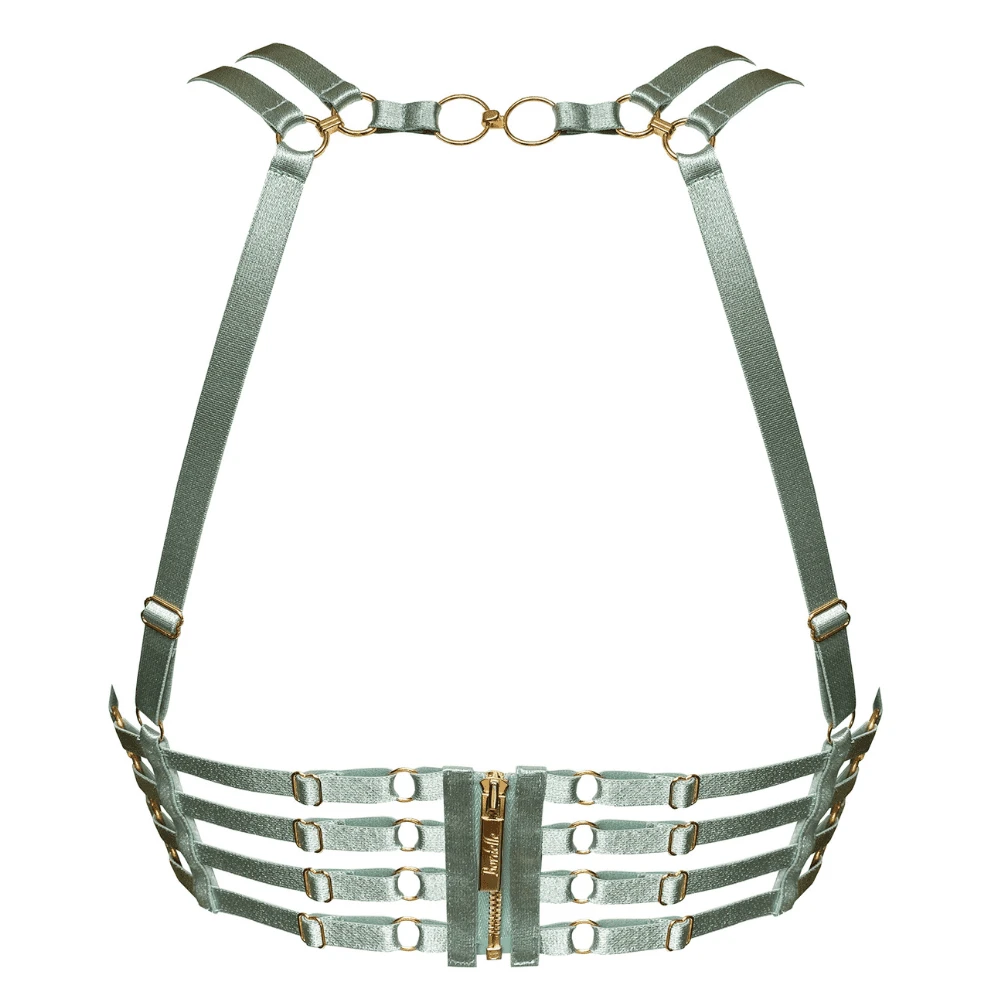 La dentelle exclusive confectionnée sur mesure pour la marque anglaise enveloppe le buste tel un bijou. La lingerie devient écrin… Sécurisé par une fermeture éclair plaqué or 24 carats, le cerclage élastique en satin entièrement réglable crée une conception de cage à l’arrière. Ajustement sur les doubles bretelles à l’avant et à l’arrière.