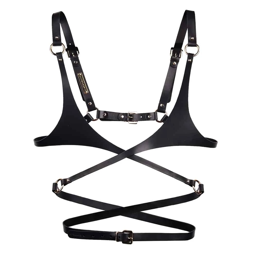 Une pièce bondage polyvalente que vous pouvez porter à même la peau, au dessus un body en résille ou une chemise blanche en popeline.