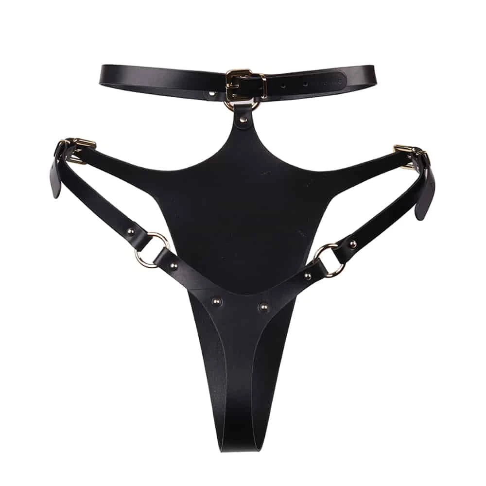 Anneaux et détails en métal plaqué or lui apporte la touche BDSM nécessaire. A associer au soutien-gorge bondage en cuir Elif Domanic