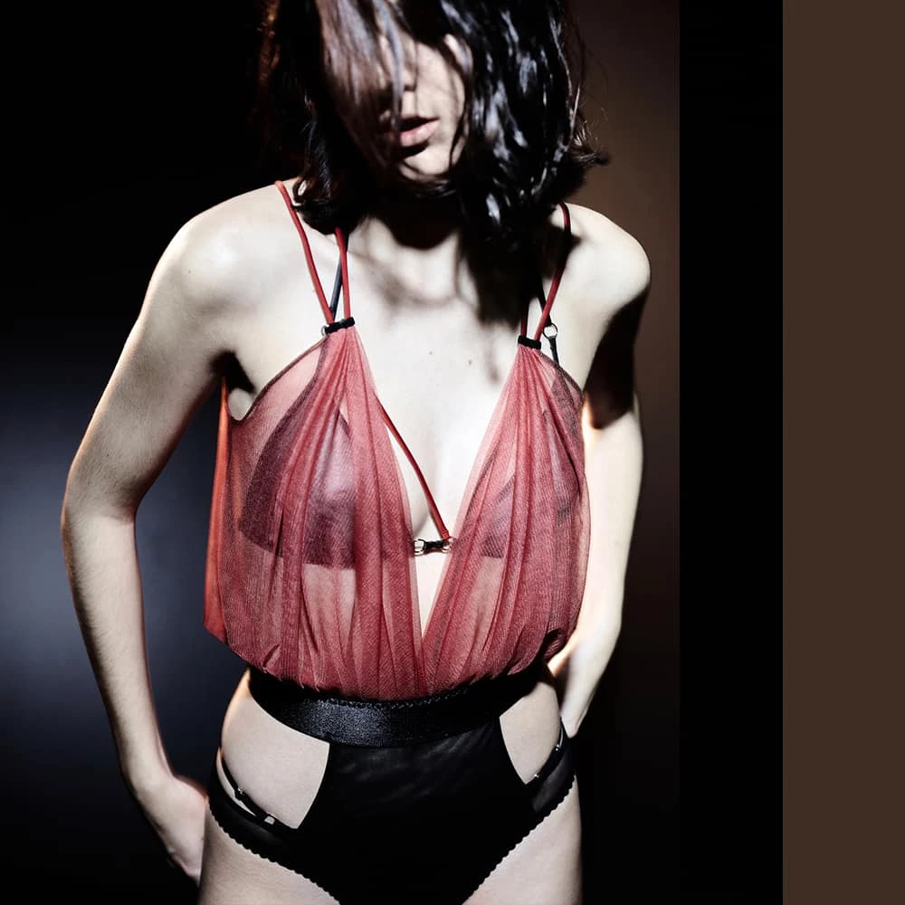 L’antithèse d’une femme plutôt réservée et timide, mais qui, pourtant, porte une tenue aussi fascinante que troublante… Ce contraste absolu est aussi bien matérialisé par le contraste de la légèreté du tulle de soie italienne et celle de la sophistication des élastiques au dos.