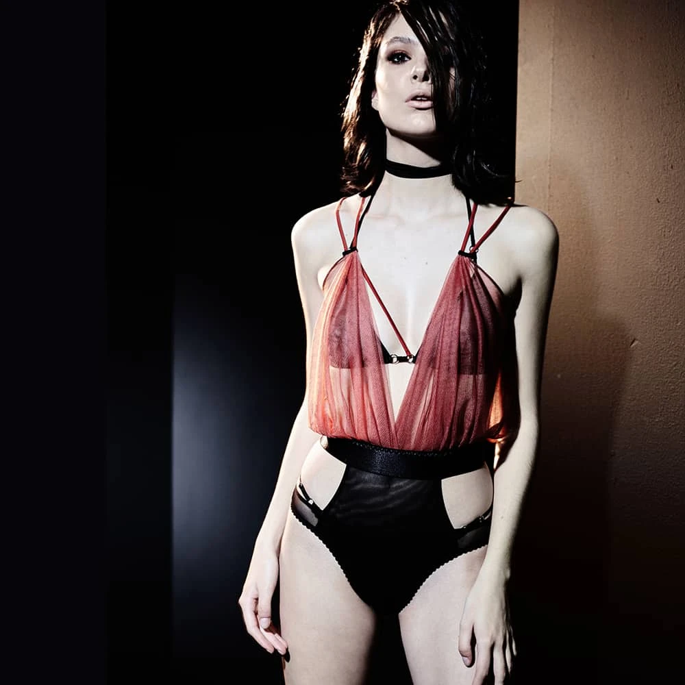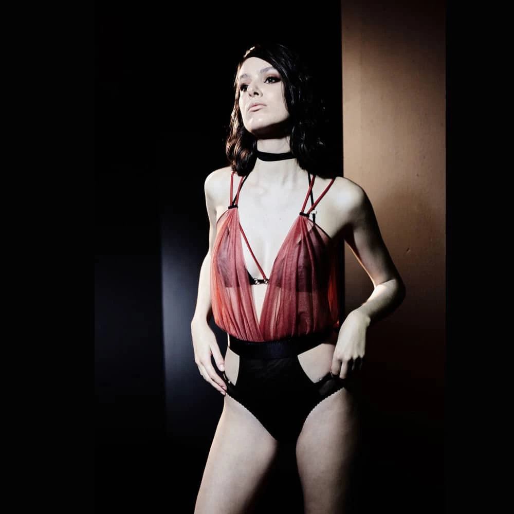 Incense Body en soie signé Gonzales Affaires, inspiré par le Body Demure, pièce emblématique de la marque, cette version rouge et noir se révèle plus piquante.