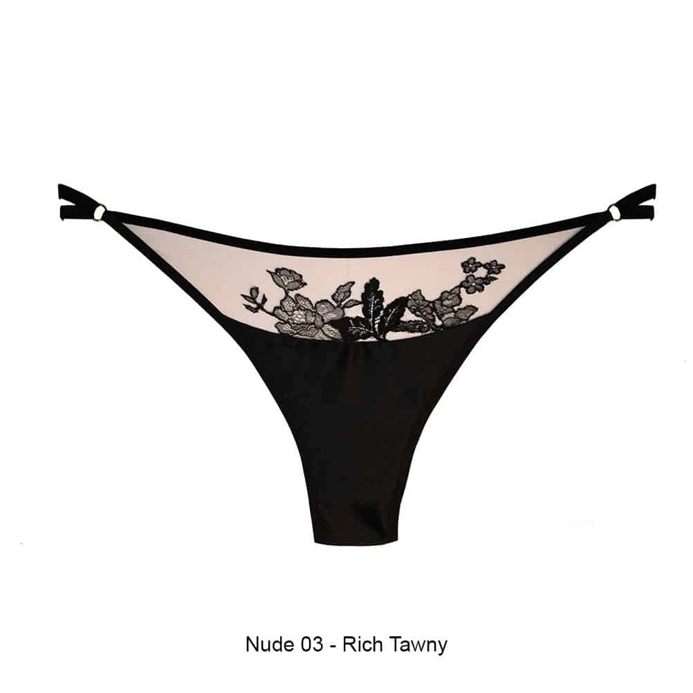 Le string échancré RAËL est fabriqué à la main à partir d’une maille illusion ultra-transparente se fondant parfaitement avec la peau et la soie, bordée d’un pli doux et d’élastiques en velours.
