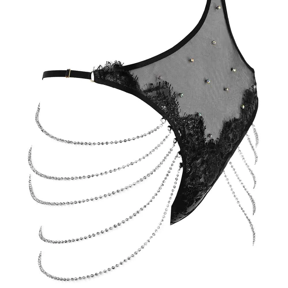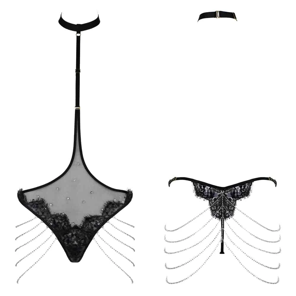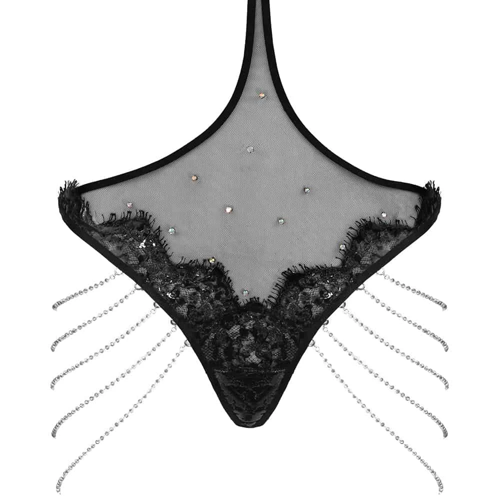 Le Galaxy Body String Crystal signé Kaimin est réalisé entièrement à la main et à la commande, à partir d’une dentelle leavers française, de tulle fin et d’élastique satiné.
