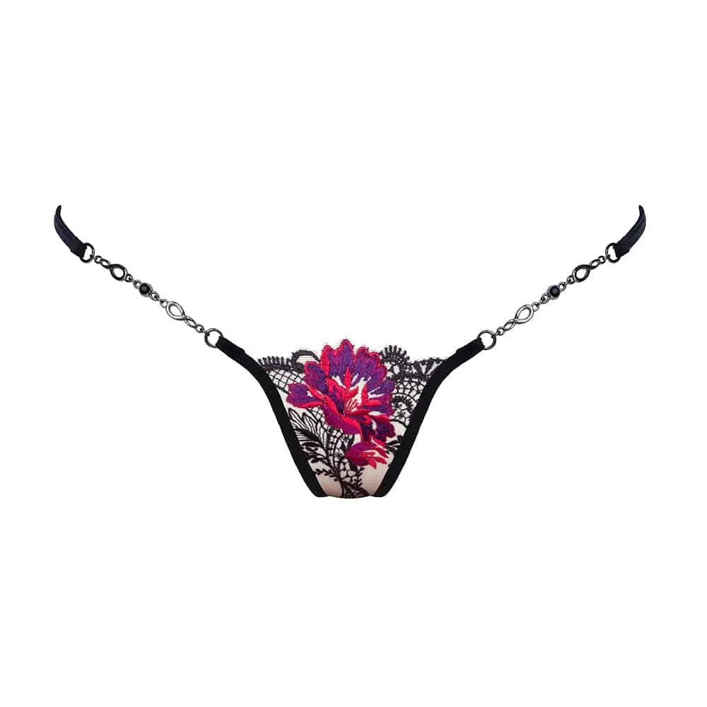 Ce mini string bijou est entièrement confectionné en Allemagne à partir de broderie Suisse produite à Saint Gall, de tulle et de fils de lurex travaillés en guipure.