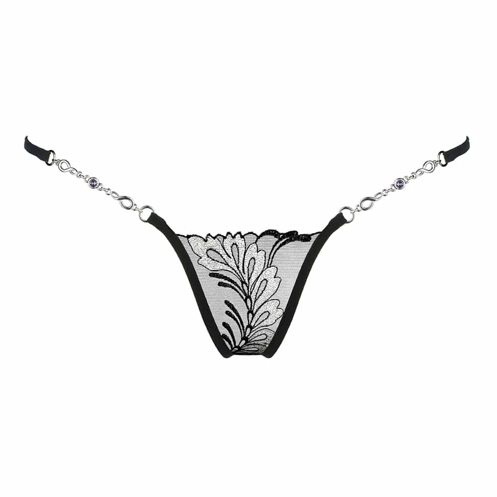 Ce mini string bijou est entièrement confectionné en Allemagne à partir de broderie Suisse produite à Saint Gall, tulle noir et fil de lurex argenté brillant travaillé en guipure.