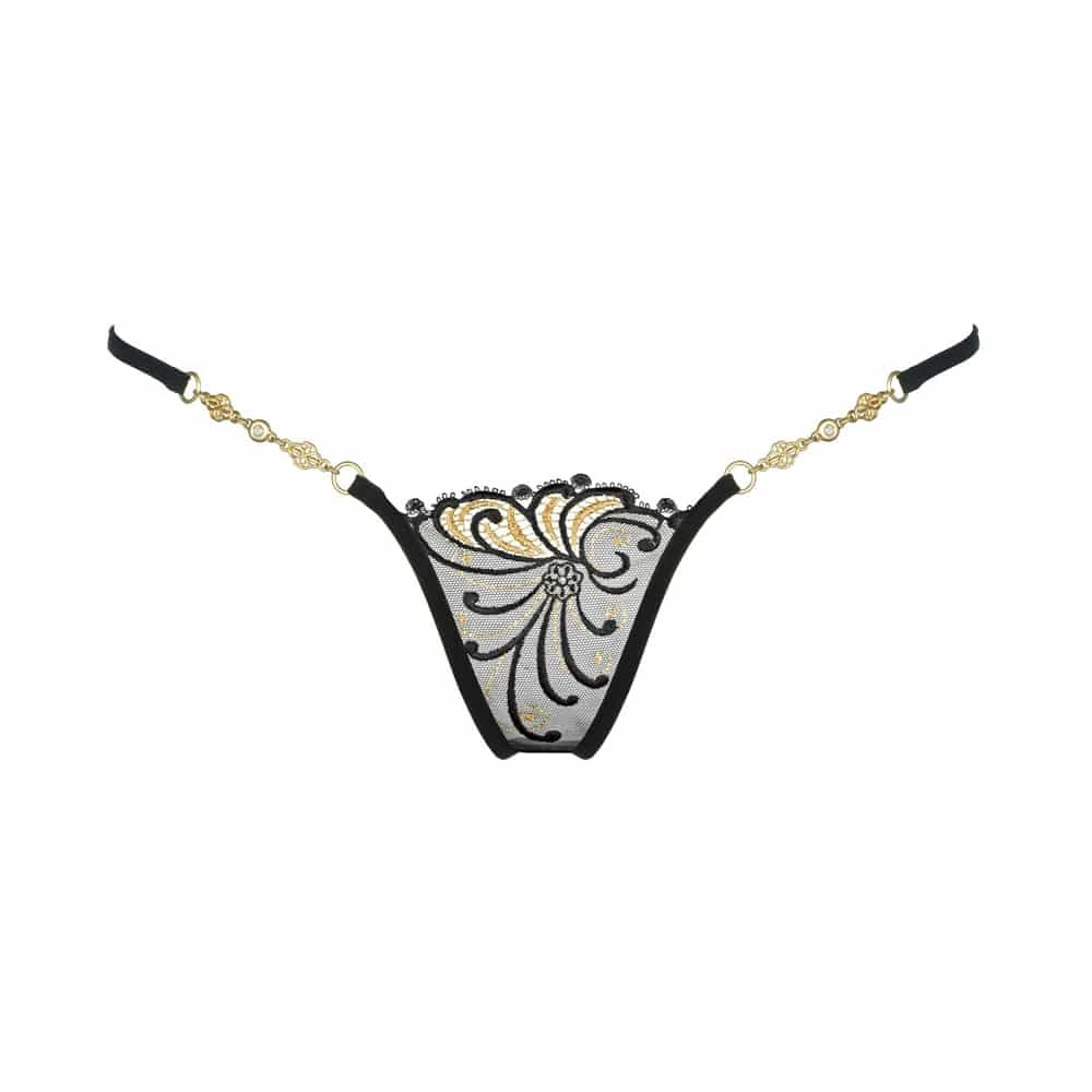 Ce mini string bijou est entièrement confectionné en Allemagne à partir de broderie Suisse produite à Saint Gall, tulle noir et fil de lurex or travaillé en guipure, et illuminé de cristaux Swarovski véritables.