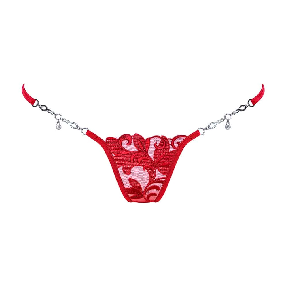 Ce mini string bijou est entièrement confectionné en Allemagne à partir de broderie Suisse produite à Saint Gall, de tulle rouge et de fils de lurex travaillés en guipure.