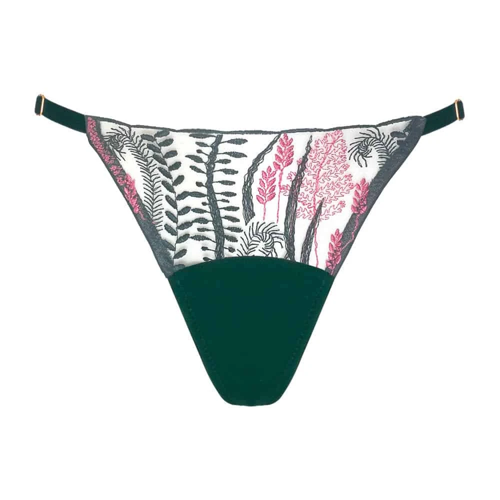 Telle une déesse de l’océan, retrouvez votre enchanteresse intérieure avec Alaria. La broderie inspirée des tiges vertes et rose vif des algues de l’océan surfe sur le tulle transparent et délicat. Broderie sur mesure inspirée des algues embellie sur un tulle discret. Broderie parfaitement contrastée par la luxueuse soie de bambou verte, une alternative végétalienne à la soie conventionnelle. Ce string a des bretelles entièrement réglables pour vous assurer un ajustement parfait et un confort optimal. Gousset en coton bio.
