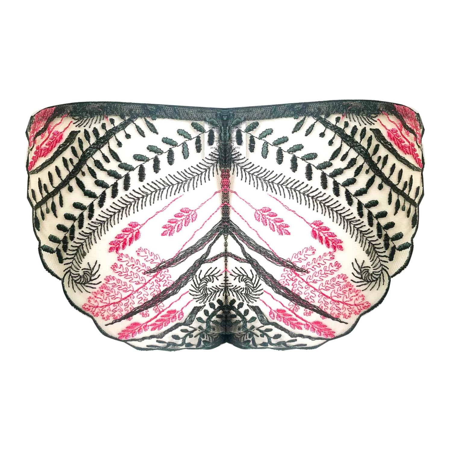 Culotte brésilienne Alaria Posie, lingerie de créateur crée pour responsabiliser les fans de lingerie fine. Une nouvelle marque de lingerie de luxe fabriquée à la main et de manière éthique, à partir de matériaux durables et biologiques en Angleterre. Posie fait partie de ces nouvelles marques de luxe qui réinventent la lingerie telle que nous la connaissons. La nature se retrouve dans toutes les collections de Posie. La broderie florale épouse la soie de bambou (sans pesticides, à croissance rapide, hautement renouvelables) et le coton biologique. La marque se veut la plus équitable et éthique possible. L’essence de Posie est enracinée dans l’exploitation de la féminité divine. Les pièces sont conçues pour renforcer la confiance des femmes qui les portent.