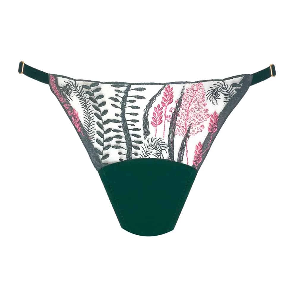 Telle une déesse de l’océan, retrouvez votre enchanteresse intérieure avec Alaria. La broderie inspirée des tiges vertes et rose vif des algues de l’océan surfe sur le tulle transparent et délicat. Tulle délicat et discret agrémenté d’une broderie d’algues vert foncé. Les tiges de fils rose vif imitent les algues rouges trouvées dans l’océan. La broderie se marie parfaitement avec la luxueuse soie de bambou verte, une alternative végétalienne à la soie conventionnelle. Cette culotte brésilienne a des bretelles entièrement réglables pour vous assurer un ajustement parfait et un confort optimal. Gousset en coton bio.
