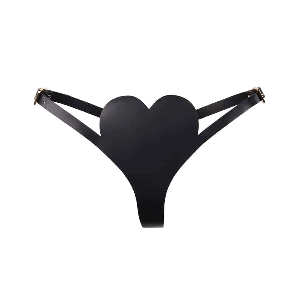 Le string cœur en cuir de veau d’Elif Domanic est une culotte harnais dit “strap” totalement ouverte que vous pouvez porter seule ou en accessoire par dessus un string ou un autre bas.