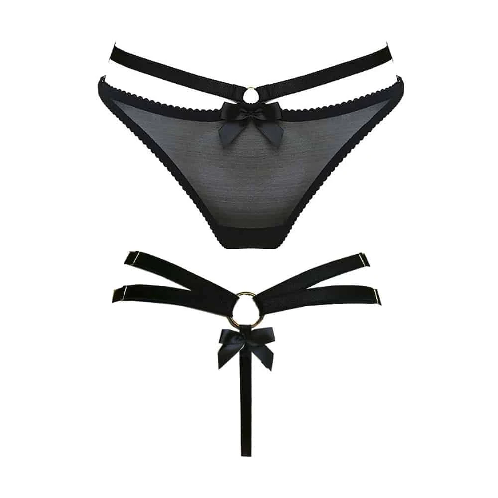 Composé de tulle fin extensible, d’élastiques satinés et d’anneaux plaqué or 24 carats à l’avant et à l’arrière. Terminé par des nœuds noirs en satin, ce modèle peut s’associer à un soutien-gorge noir pour un usage quotidien ou à un soutien-gorge ouvert pour une nuit débridée. Fond doublé 100% coton.