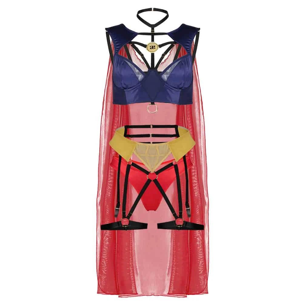 Le costume de rôle Play Super Lady comprend un soutien-gorge à armatures avec cape en résille, un porte-jarretelles et une culotte.