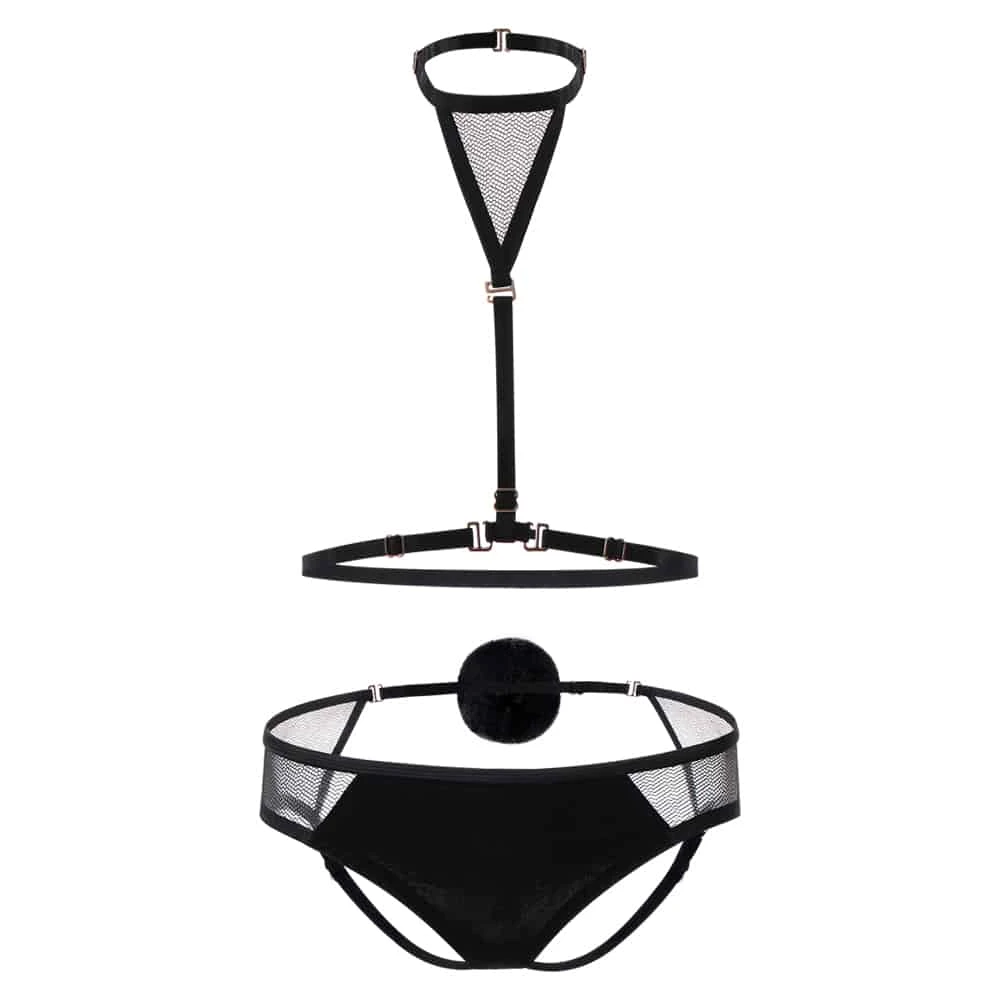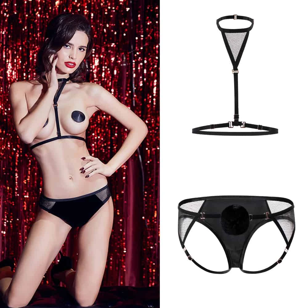 Ensemble composé d’un harnais et d’une culotte ouverte. Le harnais vous fera un dos magnifique, les élastiques enlaceront vos courbes en douceur. Une pièce polyvalente à porter au quotidien ou en mode lingerie sexy. La culotte ouverte sur les fesses surprendra votre partenaire lorsqu’il découvrira la petite queue de lapin en fourrure.